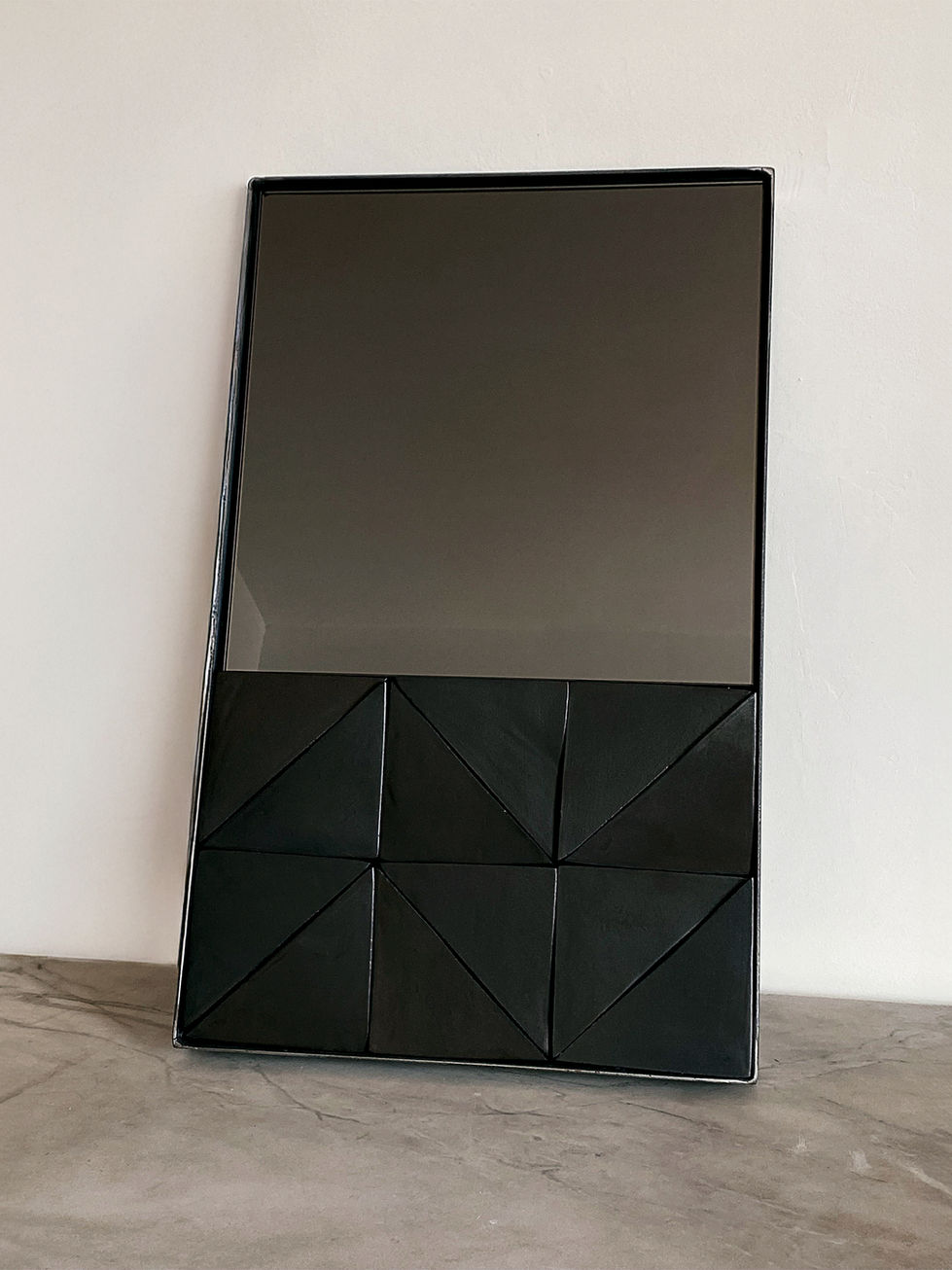 The ALCOA II combines anthracite mirror, steel and three-dimensional elements of glazed ceramic. The lines of the ceramic pieces echo the architecture of an iconic 1950 building in Pittsburgh. This mirror features a monolithic black finish.